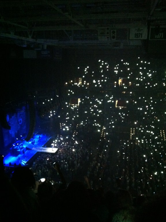 To be completely honest, I like Justin Moore music, and I wanted to see him perform, but at the same time, I wasn’t thinking ” Oh my god, I have to see him”. But I love being proved  wrong, because he  is definitely worth going to see. Like Kip Moore, Justin Moore played all of his songs but the one thing I noticed about him. He was so humbled to be on stage, he did  a sort of “Tebow” pose  for about a minute or two but he was just literally on stage listening to people screaming and you could tell he was blown away by the crowd’s reaction. He also got the entire crowd to pull out their cell phones and light the whole arena which was really cool. Below is a picture to show you what I mean.